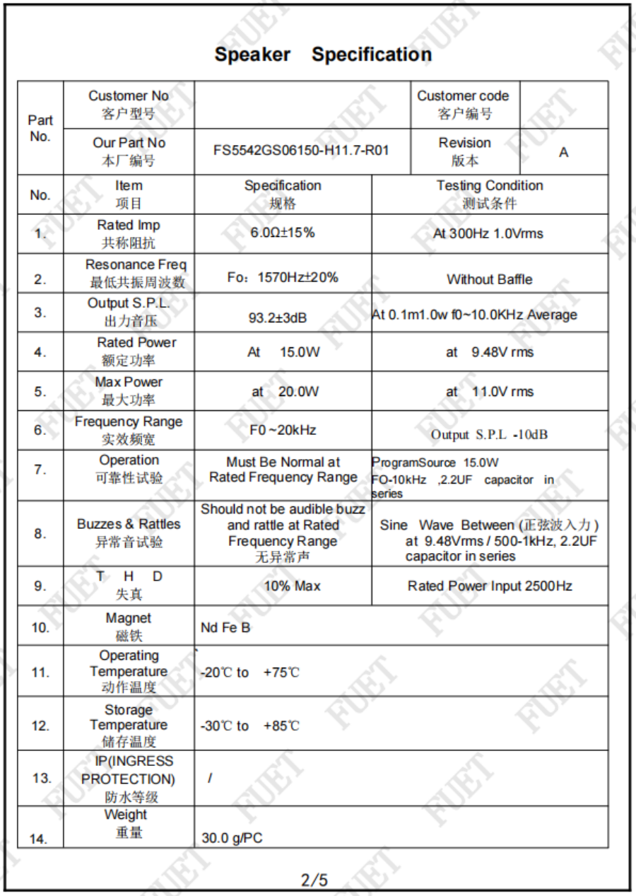 最低共振周波數(shù) 1570Hz±20% Without Baffle